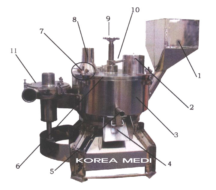 1.재료투입구 및 에어유입구: 에어량에 따라 재료투입량에 조절됨과 동시에 분쇄물의 세밀도에 영향을 미친다.